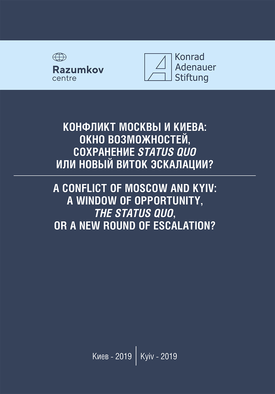 Підготовлений Центром Разумкова за підтримки Представництва Фонду Аденауера в Україні. В цьому виданні представлені позиції і прогнози німецьких, українських і російських експертів щодо перспектив конфлікту Москви і Києва в контексті зміни влади в Україні. Становлять інтерес пропозиції з мінімізації російсько-українського протистояння, зниженню напруги на Донбасі. Також у виданні опубліковані деякі результати соціологічних досліджень Центру Разумкова за період 2014-2019рр.